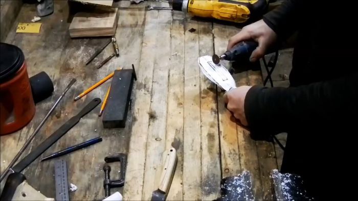 На получившейся лопатке нужно сделать 2 продольных реза для формирования петли под поясной ремень. Удобней всего это делать бормашиной.