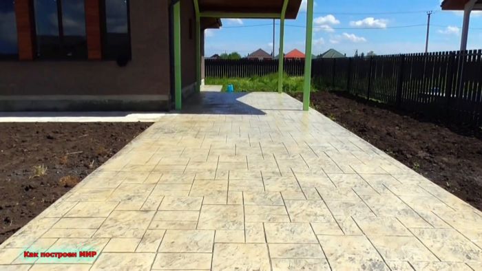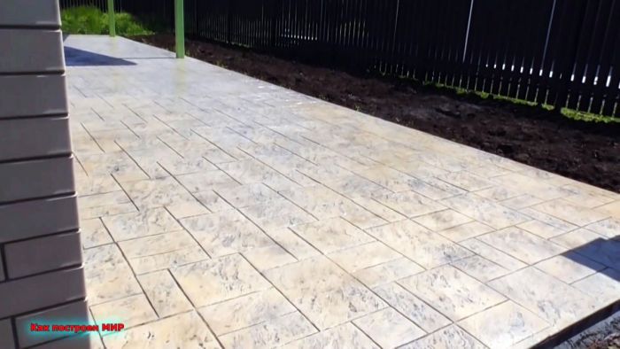При желании уложить во дворе тротуарную плитку есть смысл задуматься о выборе в пользу печатного бетона. Он представляет собой монолитную плиту с упрочненным верхним слоем и декоративной отделкой лицевой поверхности. Она может имитировать плитку, камень и прочие материалы. Преимущество печатного бетона в отсутствии проседания, растрескивания, прорастания растений между блоками и в более высокой скорости укладки.