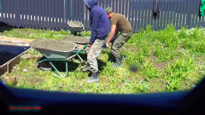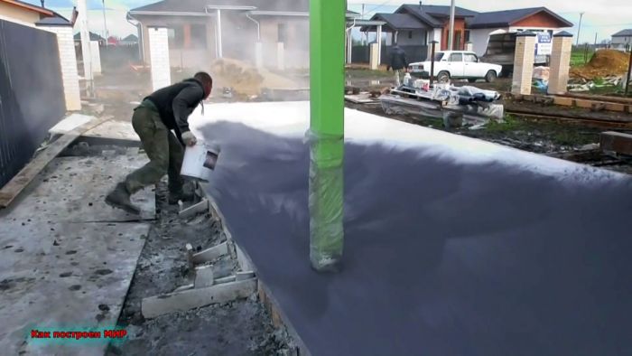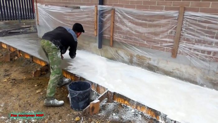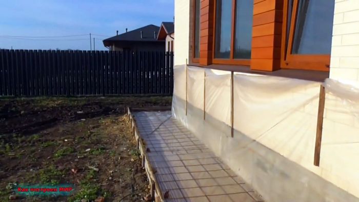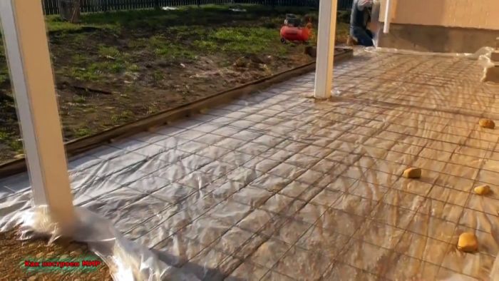 На участке делается разметка под заливку бетона и собирается по ее периметру опалубка из доски. Высота плиты для заезда автомобиля должна составлять не менее 100 мм, для пешеходной зоны достаточно 60 мм. На подготовленное основание укладывается полиэтиленовая пленка с напуском на стены, если плита с ними соприкасается. Затем делается армирование дорожной сеткой.
