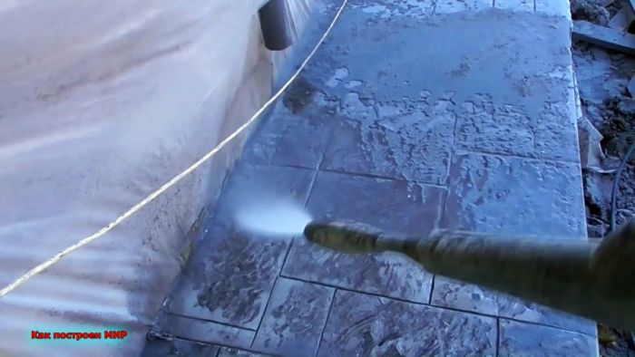 Через 5-6 дней с момента заливки разделитель выметается и смывается. Затем поверхность дополнительно промывается раствором соляной кислоты, чтобы проявить рисунок.
