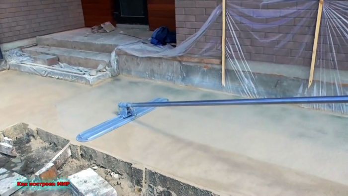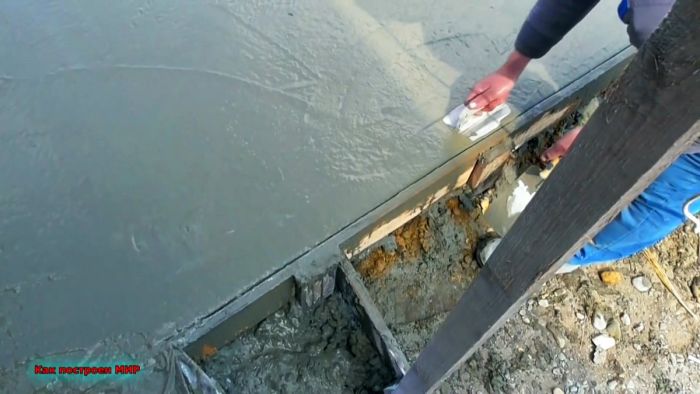 После сетки укладывается бетон и выравнивается до глянцевой поверхности. По месту примыкания с опалубкой края скругляются кельмой, чтобы избежать окантовки задерживающей осадки.