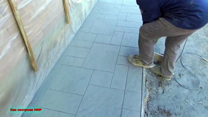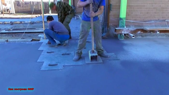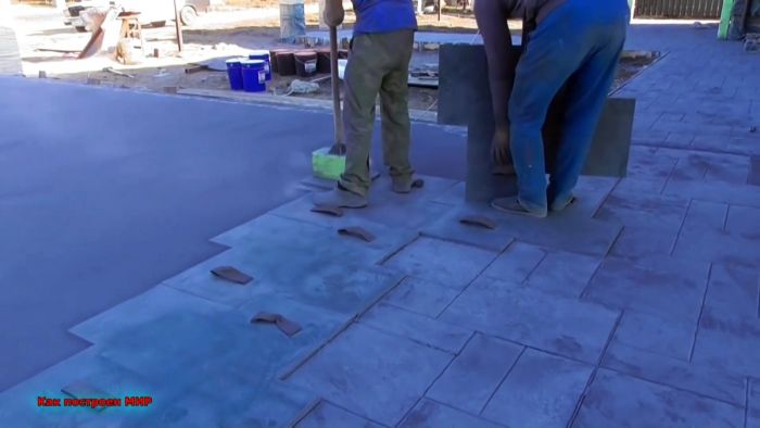 После достаточного затвердевания на плиту укладывается штамп, и бетон пропечатывается. Нужно прикладывать форму, ставать на нее сверху и дополнительно пристукивать, оставляя четкий оттиск. Данную работу лучше делать в паре и несколькими штампами, чтобы успеть до застывания бетона.