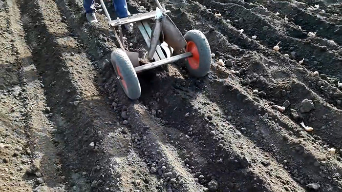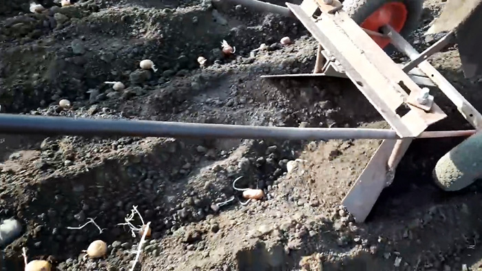 В это время помощники забрасывают картофель в ряды с интервалом между клубнями согласно рекомендуемой схеме посадки выбранного сорта. Обычно это 30 см. Если грунт в момент работы окажется слишком плотным, то на раму сверху привязывается утяжелитель.