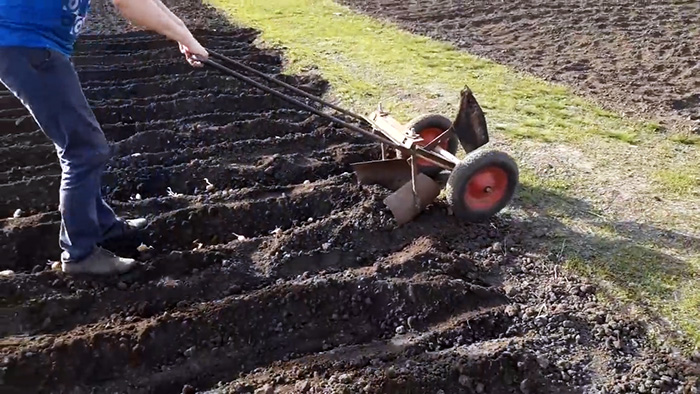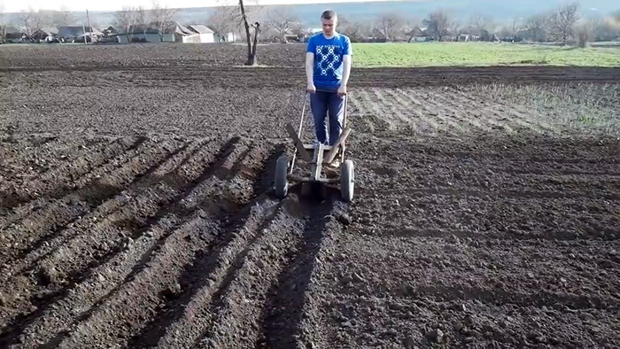 На участке делается разметка первого ряда. Важно, чтобы он был прямым, тогда все последующие также будут ровными. Затем устройство устанавливается плугом на разметку. Оно тянется на себя, при этом движение выполняется спиной вперед.