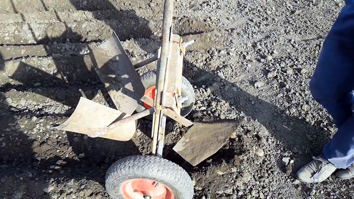 При изготовлении пробного устройства нужно установить колеса на ось, так чтобы колесная база составила 60 см. Затем к ней приваривается Т-образная станина из уголка. На станину крепится покупной или самодельный плуг. Он приваривается ближе к колесам. На противоположную сторону относительно плуга навариваются 2 щеки на стойках, расположенные относительно друг друга под углом. Их можно выгнуть из листовой стали или просто вырезать из толстостенной трубы большого диаметра. Затем приваривается длинная П-образная ручка из трубки. Она соединяется с осью колес и станиной.