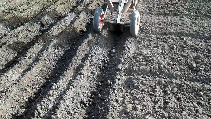 Для рытья второй траншеи устройство разворачивается и устанавливается колесом в свой старый след. Таким образом, удастся соблюсти отступ между рядами 60 см.