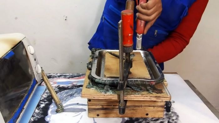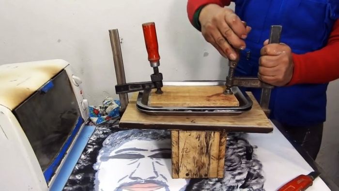 Под формы подкладывается широкая деревянная доска, фанера или ДСП. На верхнюю форму укладывается доска поменьше, подогнанная под размер дна. Затем через них все сдавливается струбцинами. Их нужно стянуть с такой силой, чтобы пластик равномерно выдавился через бортики форм. Для удобства перед установкой струбцин формы с досками лучше поставить на кирпич, блок или ящик.