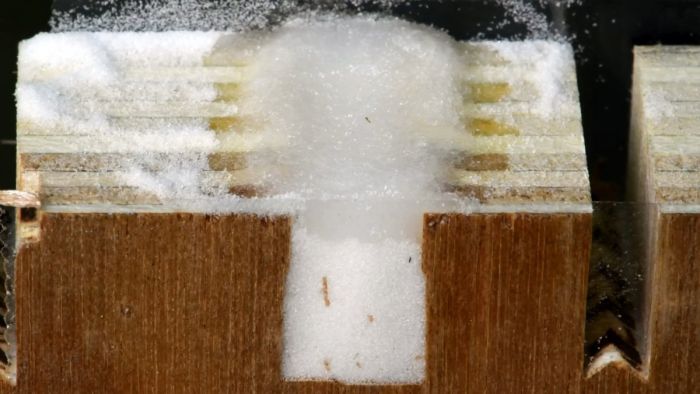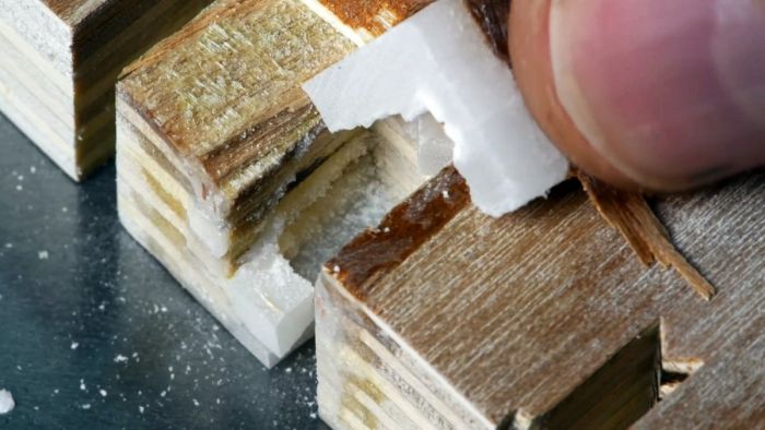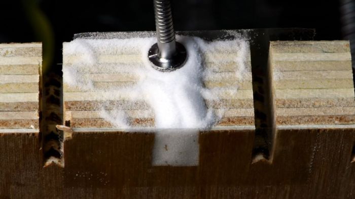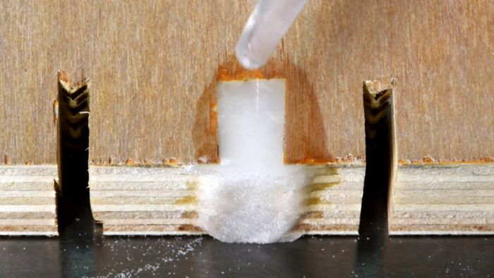 Если же наращенная масса должна обрабатываться, к примеру, ее требуется пропилить, то можно увидеть в середине не склеенную соду, которая высыпается. Таким образом, можно прийти к выводу, что подобный метод не работает когда деталь нужно подрезать или сверлить. Однако там где сода пропитана клеем полностью состав удерживается хорошо.