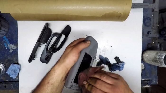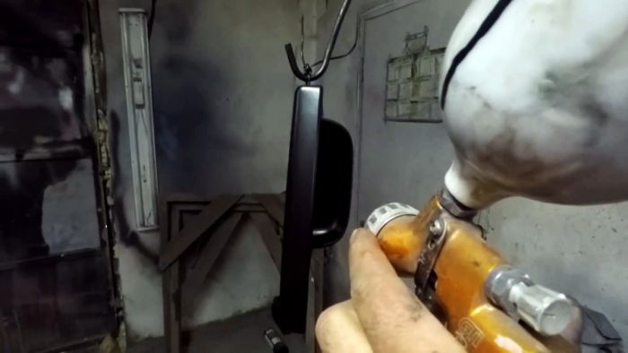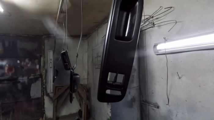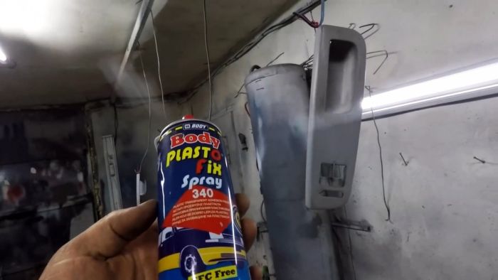 Перед покраской детали подвешиваются. После этого на них наносится 2-3 слоя аэрозольной грунтовки для пластика. Ее применение исключит шелушения новой краски хлопьями. Пауза на высыхание меду слоями праймера делается 10 мин.