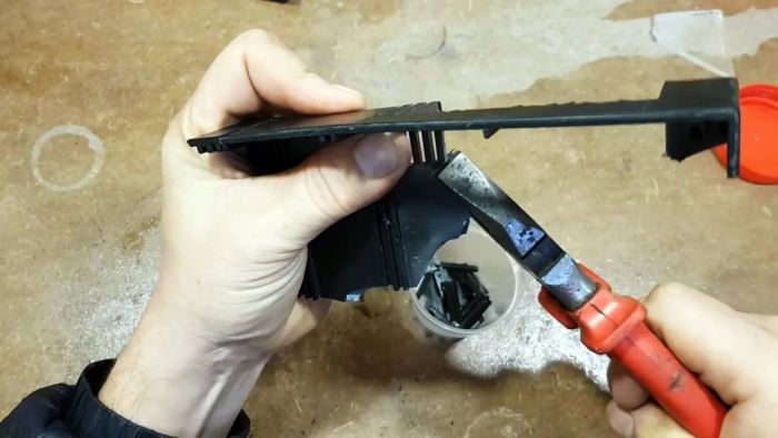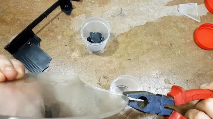 Руками или при помощи пассатижей крошим черный пластик, чем мельче будут фрагменты, тем лучше. В идеале его необходимо превратить в порошок (хлопья) рашпилем.