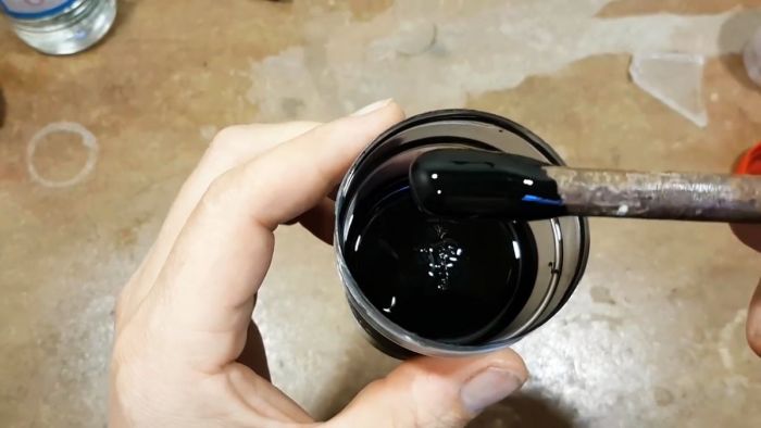 Проверяем свойства получившегося состава: опускаем в него металлический пруток и видим, что жидкий пластик обладает высокой адгезией к его поверхности.