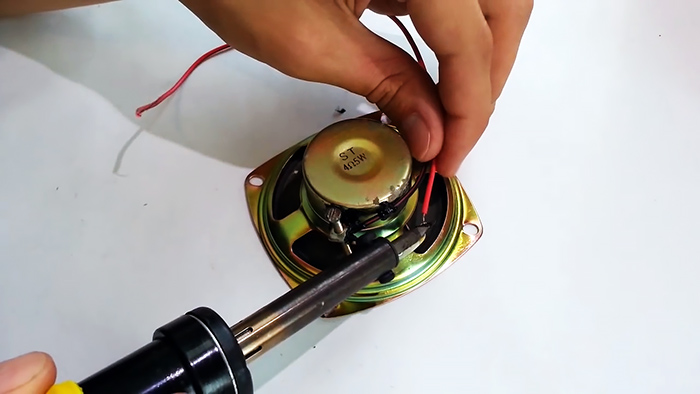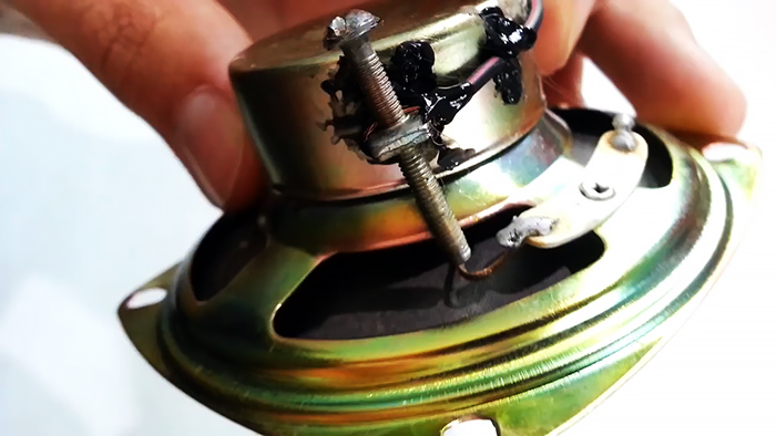 Приклеиваем его к корпусу динамика, к магниту конкретно, вместе с проводом. Двухкомпонентная смола или «холодная сварка» подойдут для этого как нельзя лучше.