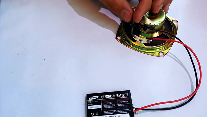 Никаких схем и транзисторов не понадобится, только сам динамик, пара проводов, винт и гайка.