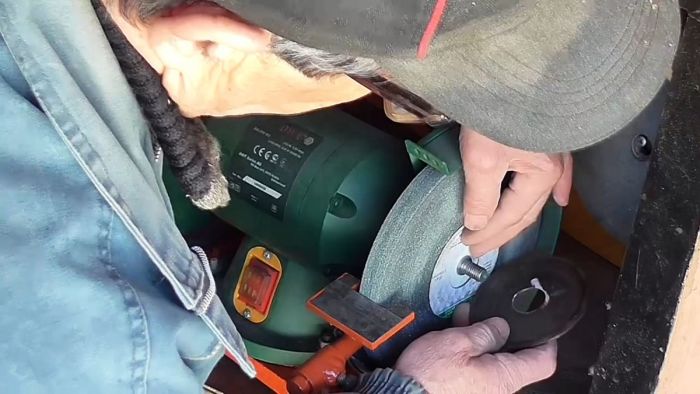 После такой доработки можно убедиться, что наждачный круг продолжит останавливаться отметкой вниз. Чтобы компенсировать смещение центра тяжести, нужно отпустить гайку и слегка сдвинуть самодельный диск в противоположную сторону от сделанной метки. Это частично компенсирует дисбаланс. Снова прокрутив наждачный круг нужно посмотреть, где он остановится. Если смещение центра тяжести стальным диском недостаточное, то его нужно еще немного сдвинуть. Таким образом, положение меняется до тех пор, пока наждачный круг не перестанет после прокручивания опускаться отметкой вниз.