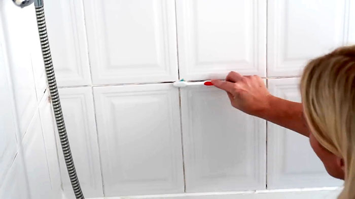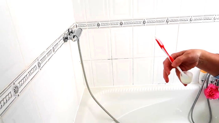 Затем чистящую массу можно интенсивно растирать с помощью жесткой губки для мытья посуды. Это позволит сразу же удалить свежие новообразования, которые еще не успели проникнуть в щели и въесться в швы. Здесь мы используем не столько химическую активность чистящей смеси, сколько ее абразивные качества.