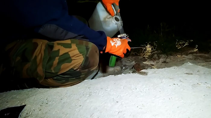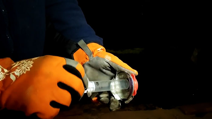 После этого закручиваем крышку с установленным в нее шприцем в резьбовое отверстие пистолета. Для того, чтобы соединение было прочным и герметичным слегка прогреваем его пламенем газовой горелки. В результате пластик немного размякнет, а клей быстрее затвердеет.