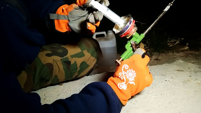От пустого баллона, с помощью любого подходящего инструмента, отрезаем верхнюю часть, в которой установлен пластмассовый клапан. Он нам не пригодится, поэтому удаляем его с помощью пассатижей и самореза. Изнутри крышку протираем тканевой салфеткой или ветошью.