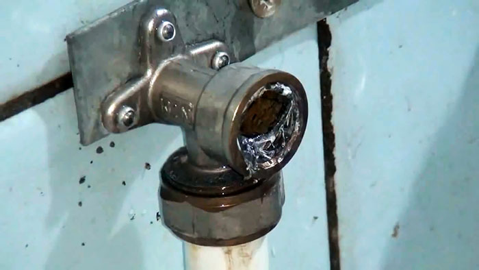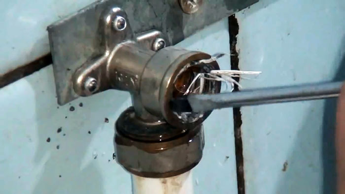 Сделав пропил, можно снова попробовать выбить эксцентрик отверткой и молотком или просто раскрошить его на кусочки. После удаления таким способом потребуется подать воду, чтобы промыть водорозетку и трубы от упавших внутрь осколков.