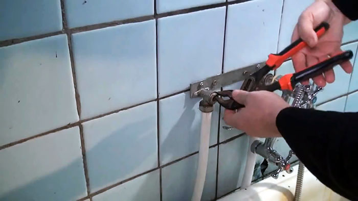 Перед заменой эксцентрика нужно перекрыть воду и снять смеситель. Следует действовать аккуратно, чтобы не поцарапать ключом его гайки. В идеале обмотать губки ключа изолентой или малярным скотчем, тогда царапин точно не будет.