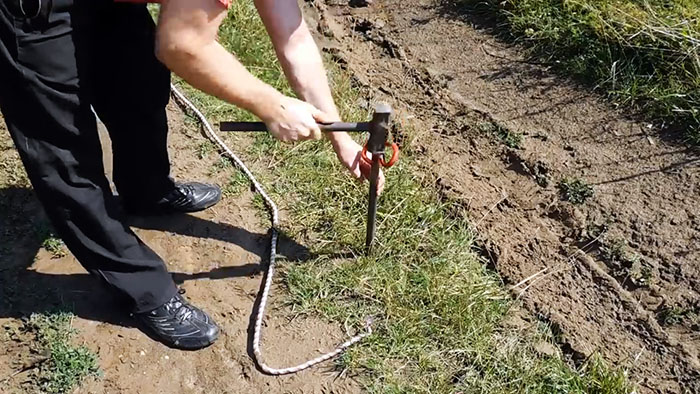 Свободный край веревки нужно привязать к дереву, а если его нет, то забить в землю кол.