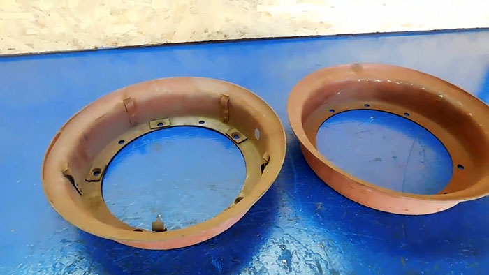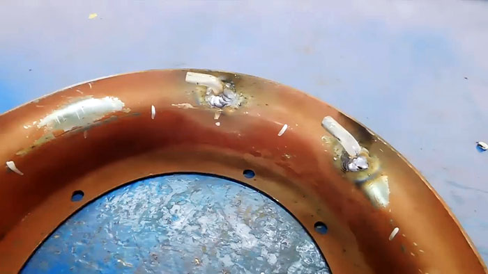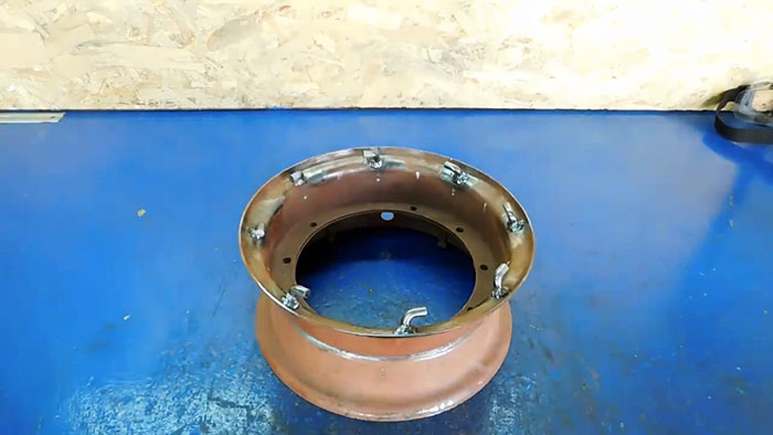 К данным отметкам нужно приварить Г-образные зацепы, согнутые из любого достаточно толстого стального кругляка. Важно, чтобы с их помощью можно было сцеплять доработанный диск и колесо через его отверстия.