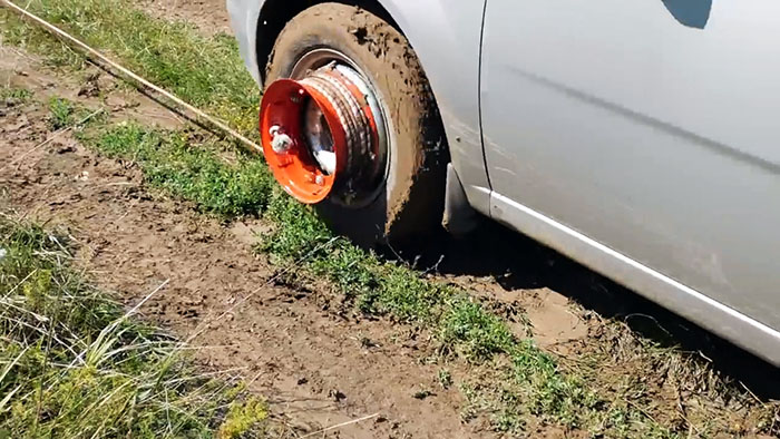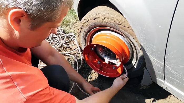 Застряв в луже, колее, песке или снегу достаточно зацепить шпулю на диск ведущего колеса. В его отверстие под сосок камеры заводится крепкая веревка, и ее конец завязывается в узел, чтобы канат не вышел обратно.