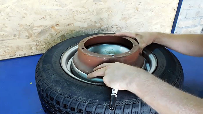 Для удобства разметки заготовки и ее дальнейших примерок нужно снять колесо или достать запаску. К нему прикладывается диск и выставляется соосно. На нем делаются отметки напротив отверстий колеса.