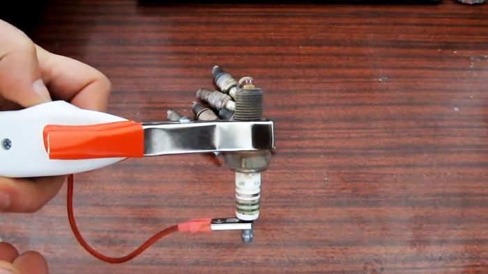 Для тестирования свечи, та зажимается в большом крокодиле на резьбовой части. Маленький зажим ставится на контактный наконечник. После нажатия на кнопку высоковольтный преобразователь подает разряд на свечу. Если она работающая, то в ее зазоре между боковым и центральным электродом должна появиться бьющая искра. У неработающей свечи искры не будет.