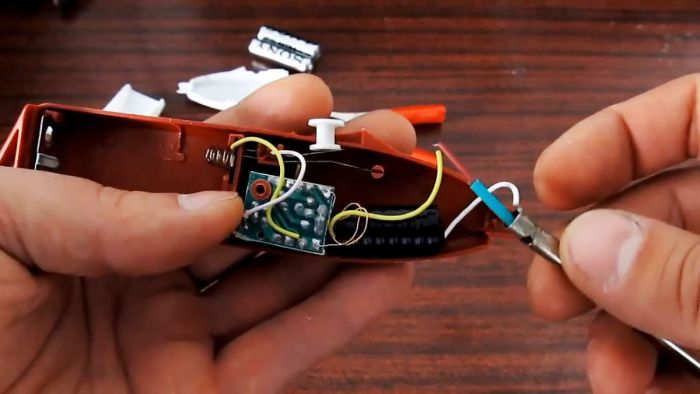 Корпус зажигалки разбирается. Нужно удалить выходящую из него металлическую штангу, она больше не потребуется. Подключенные к ней провода отсоединяются.