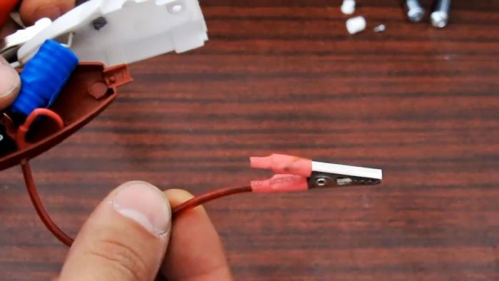 К крокодилу присоединяется провод из катушки зажигалки. Для него также потребуется просверлить или прожечь тонкое отверстие в корпусе.