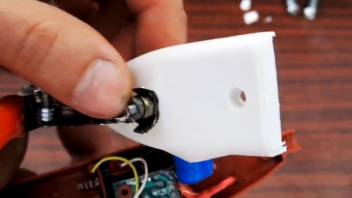 Второй провод нужно вывести сбоку. Для этого сверлится отдельное отверстие. Чтобы он меньше изнашивался, его стоит защитить от излома термоусадкой. На конце провода закрепляется маленький зажим. Скорей всего длины имеющегося проводка будет недоставать, тогда до монтажа термоусадки и зажима придется его нарастить небольшим отрезком в 15 см.