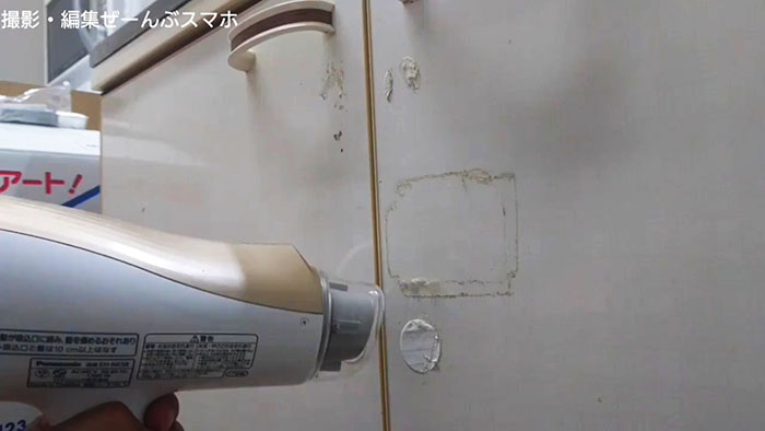 Давайте попробуем. Включаем фен и 5-15 секунд прогреваем следы горячим воздухом, в данном примере от самоклеющегося крючка.