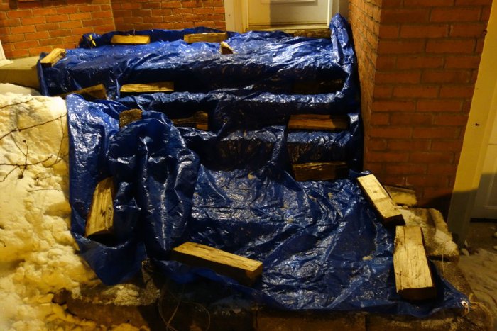 Далее выкладываем его на дорожку, скажем, перед домом. По краям раскидываем бревнышки, чтобы брезент не унесло ветром.