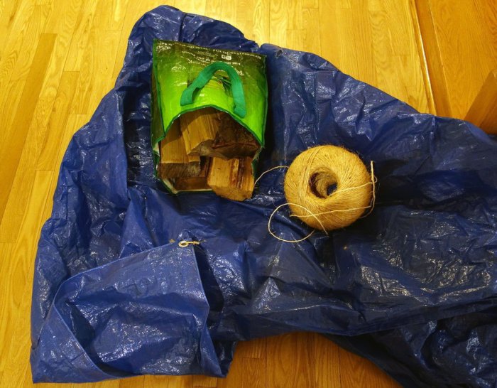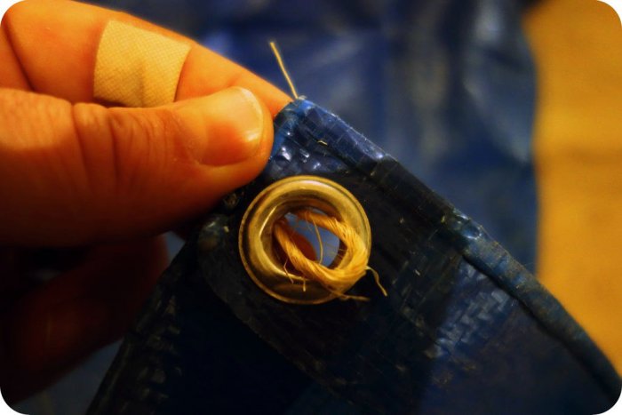 По краям брезента привязываем веревку. К каждому краю свой отрезок. Также привязываем бока, если брезент широкий.