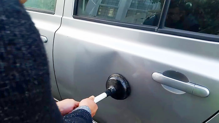 Рекомендуется сначала не втыкать вантуз прям в самую середину вмятины, а идти от ее боков.
