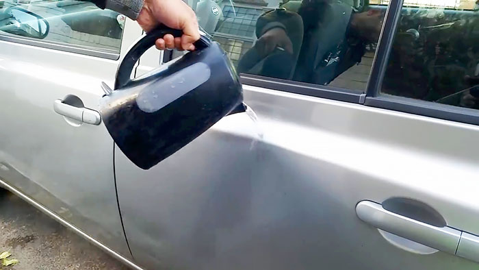 Первое, что необходимо сделать, чтобы облегчить себе процес выправления, это облить вмятину кипятком. Берем вскипевший чайник и неторопясь поливаем вмятину и ее прилегания вокруг. Не беспокойтесь, заводская краска точно не слезет.