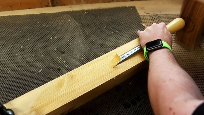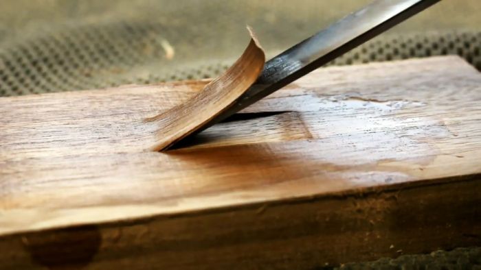 Устанавливаем лезвие стамески в район вкручивания метиза под оптимальным углом и несильными ударами киянки по ручке инструмента отделяем полоску древесины длиной 5-6 см.