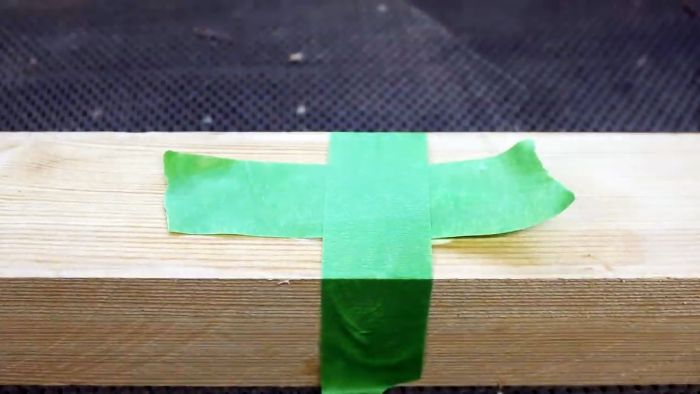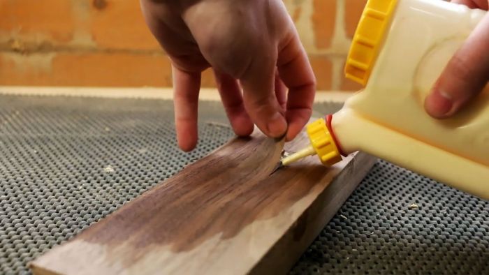 С некоторым запасом смазываем клеем отогнутую полоску и углубление в древесине, прижимаем их друг к другу и наносим сверху скотч, ленту или кусочек полиэтиленовой пленки.