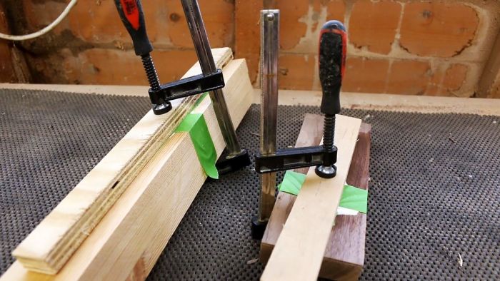 Кладем поверх всего прижимную планку, стягиваем струбциной или зажимаем в тиски. Можно просто на склеиваемое место положить тяжелый груз.