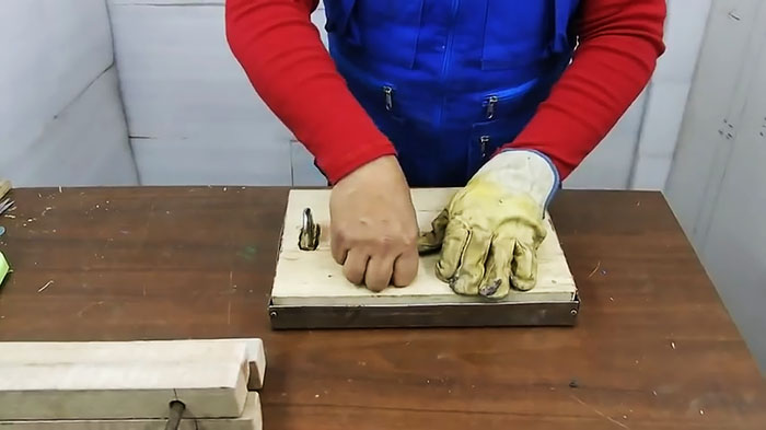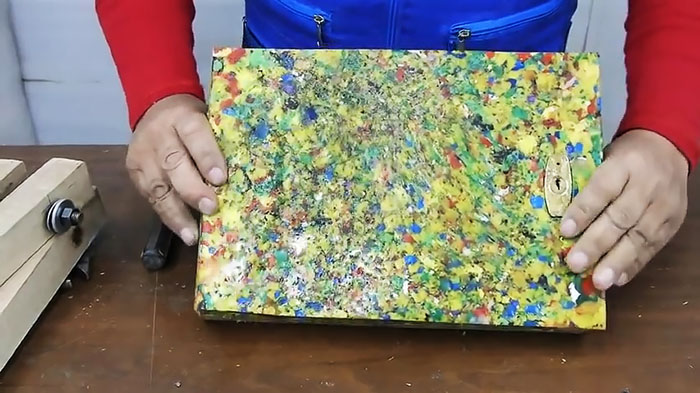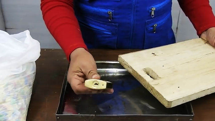 Вытаскиваем шаблон с замком и, прилипшей к ним затвердевшей доской пластика, из формы. Отделяем с помощью отвертки деревянную и пластиковые доски. Затем, используя еще и молоток, удаляем из отверстия в пластиковой доске замок.