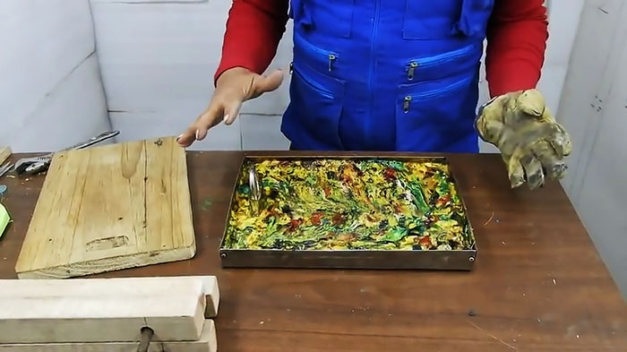 Возвращаем форму с расплавом на стол и укладываем поверх деревянный шаблон, смазанный по плоскости контакта растительным маслом для предотвращения прилипания.