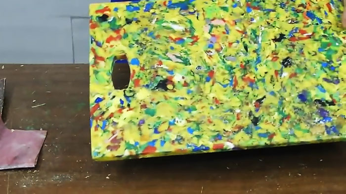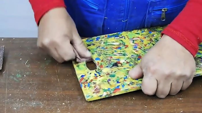 Вчерне разделочная доска из пластика готова. Осталось ее обработать. Вначале абразивным бруском снимаем наплывы и заусенцы по краям.