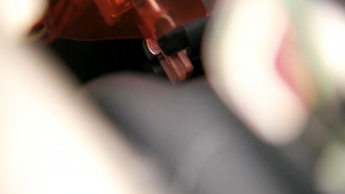 Натягиваем в сторону, чтобы нить упала на крючок замка. Далее с усилием тянем в противоположную сторону.