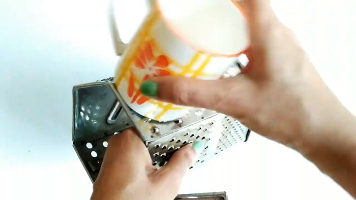 Переходим непосредственно к процессу. Берем терку и «натираем» на ней кружку. Представьте что вместо кружки у вас, скажем, баклажан.