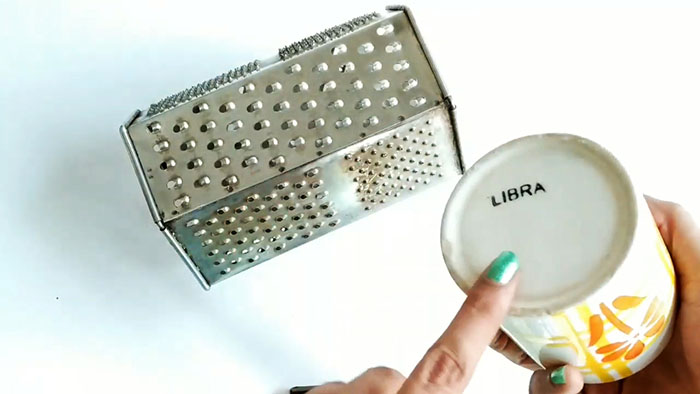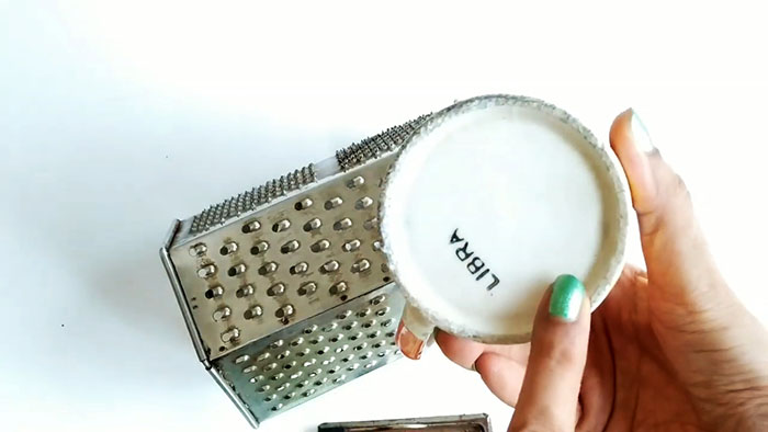 Берем обычную керамическую кружку. Снизу практически у каждой имеется абразивный кург, который вполне можно использовать для наточки зубьев терки.