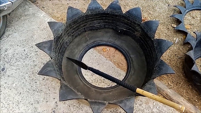 Следующий этап – выворачивание шины наизнанку, который наряду с недюжинной физической силой, потребует понимания и осмысления его принципа. Поможет нам в этом деле «рогатина» из дерева или металла, которой захватываем обрезанный край покрышки, а другой конец упираем в землю.