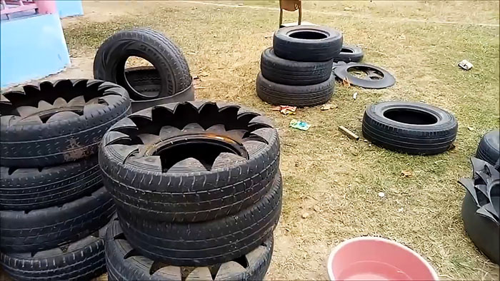 Но привлекательнее и естественнее будет выглядеть изделие, если на его одной боковой поверхности мы вырежем лепестки или листочки разного размера, которые лучше заранее нанести мелом на боковину шины.