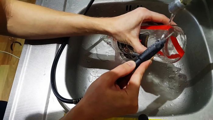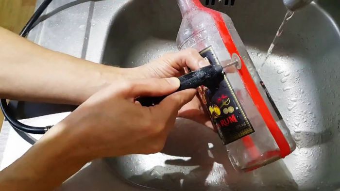 Алмазный диск и место реза нужно охлаждать холодной водой. Так как у меня нет мастерской, мне пришлось делать это на кухне. Я включил тонкую струю холодной воды, подставил под нее бутылку и начал резать. Если у вас есть тиски на присоске, можно установить их на дно раковины и зафиксировать в них бутылку.