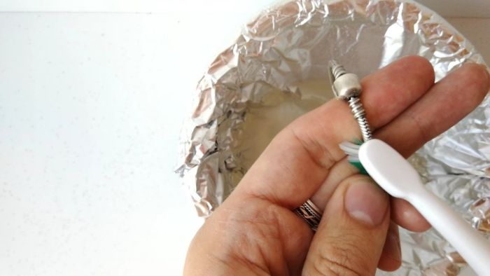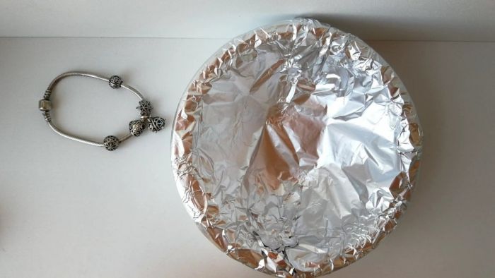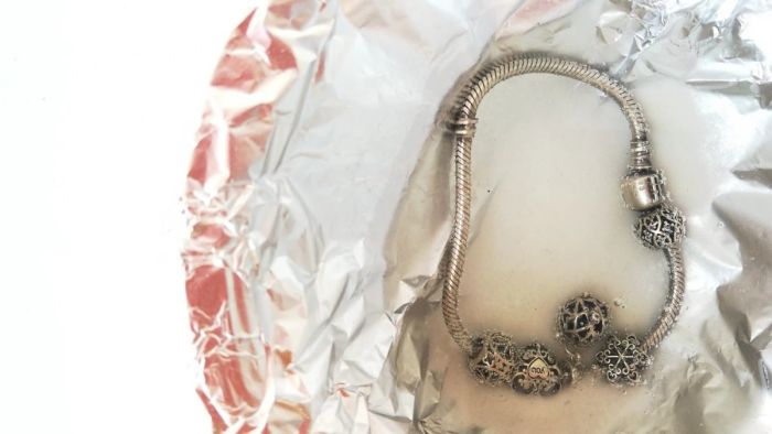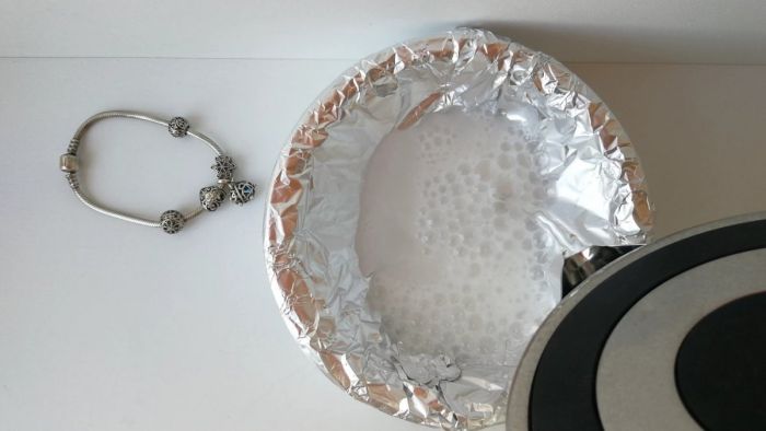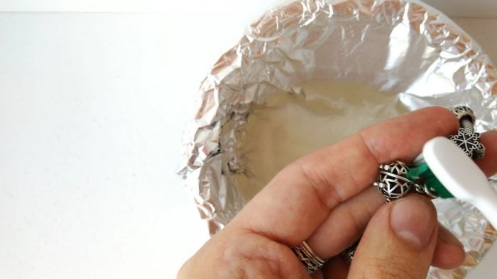 Этот способ подходит для обработки столового серебра и ювелирных украшений. Украшения не должны имеют натуральных драгоценных камней (Камни могут потускнеть).