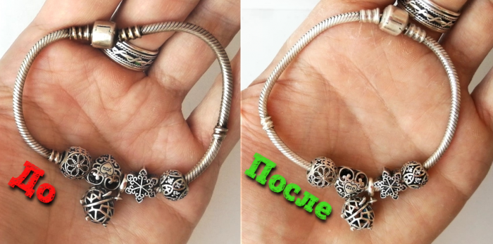 Метод воздействует только на серебро и не вредит другим составным частям украшения, что является главным плюсом.